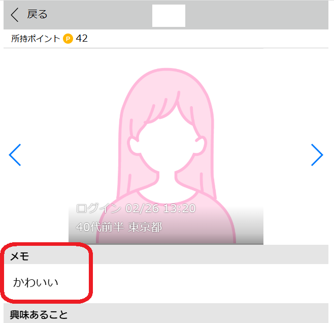 メモ登録をすると、相手のプロフィール画面に「メモ」という項目が追加され、そこに入力した内容が表示されます。