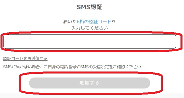 登録している電話番号宛にSMSで6桁の認証コードが届きます。その認証コードを入力します。