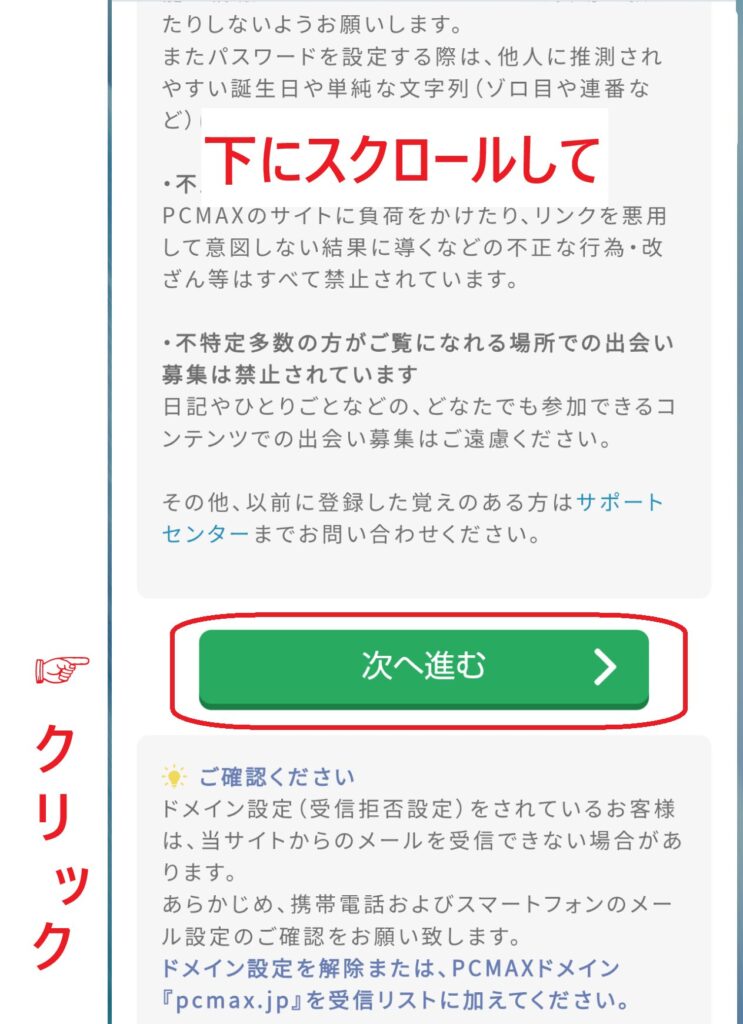 メール送信後は、画面を下にスクロールし、「次に進む」をクリックします。