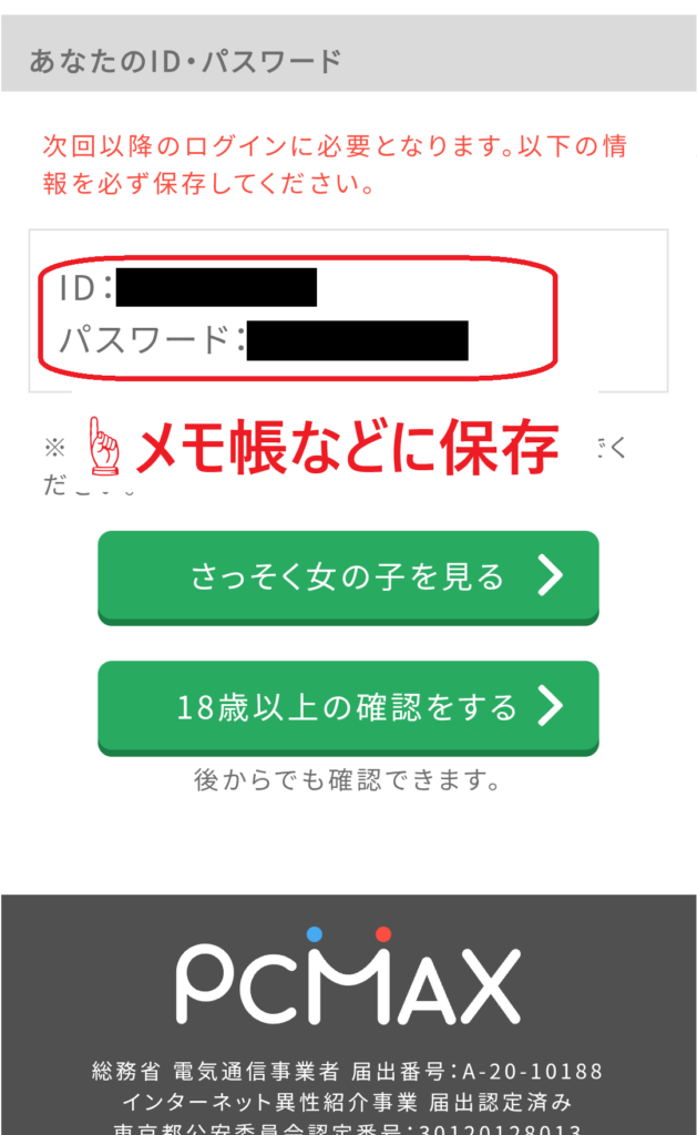 以上でPCMAXの会員登録は完了です。登録時に設定したパスワードとIDは、ログインの際に必要になるので忘れずに保存しておきましょう。