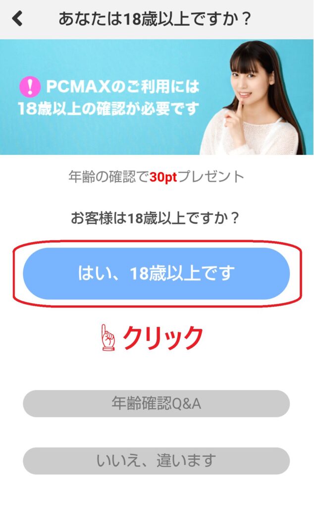 PCMAXにログインしたら、まずは年齢確認画面へ進みましょう。