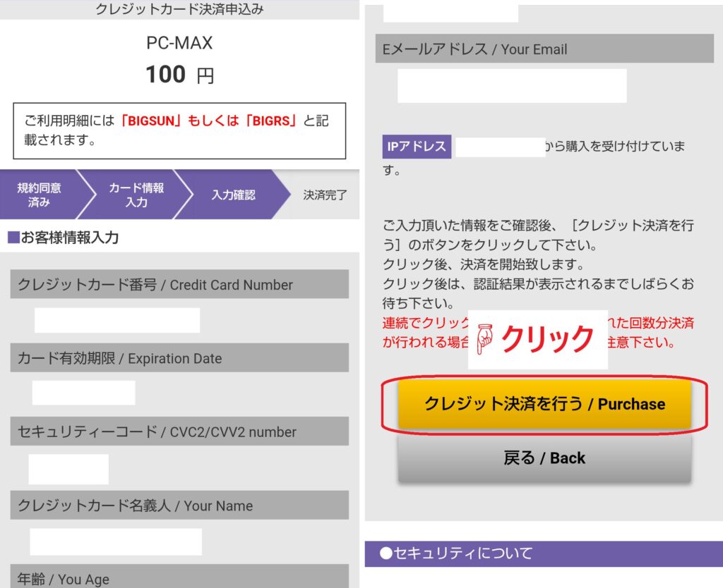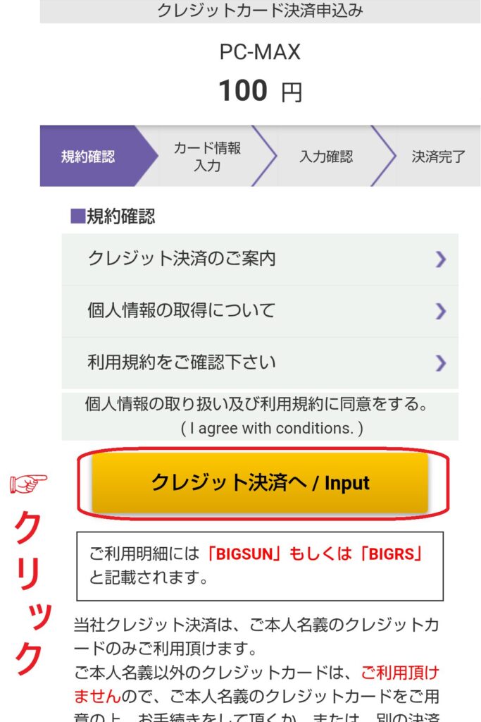 入力内容に間違いがないかを確認したら、「クレジット決済を行う」ボタンをクリックしてください。